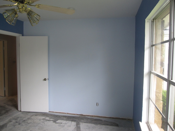 An empty blue room with an unfinished and dirty floor to be renovated.
