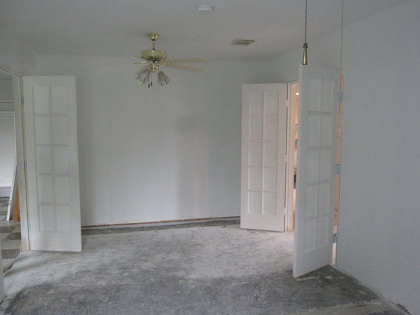 A very white room with French doors, unfinished floors and golden fan looks ready for a fresh coat of paint.
