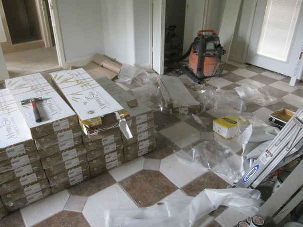 This room is being re-modeled with brown and white checkered floors and white walls.