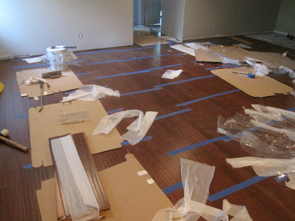 A construction site with open boxes of flooring and new wood laminate laid down.