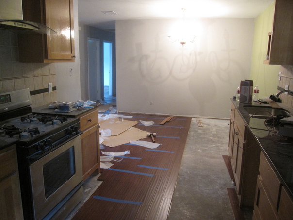 The kitchen area with half laminated and half foundation floor has area of home improvement project in progress with the appliances and cabinets on either side.