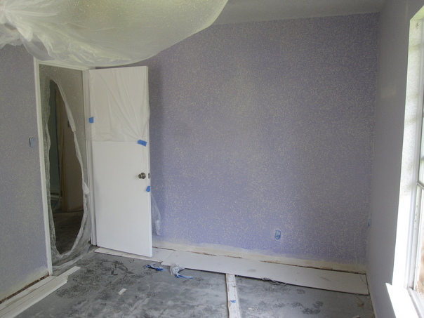 Lavender colored room under construction with thin clear plastic hanging from the ceiling.