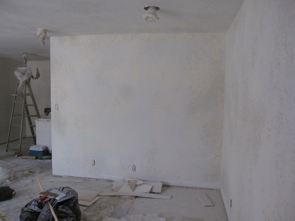 Walls have been painted with primer and are ready for a fresh coat of paint