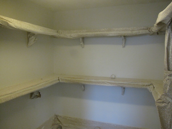 This scene depicts a small room, possibly a closet, with white walls and off-white fabric which appears to be lining shelves within the room.