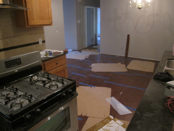 Cardboard is strewn on a floor being installed in this cluttered scene.