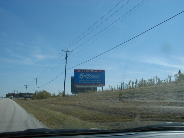 Power lines tower over the billboards, but can't blot out the vast blue sky.