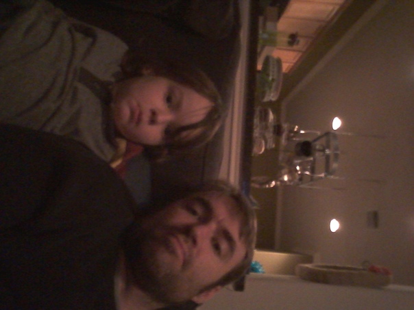 A bearded man in a dark shirt and a young child wearing a gray jacket stare into the camera in a darkened room.