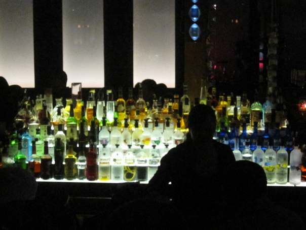 There are many bottle on the shelves that are lit up by the lights.