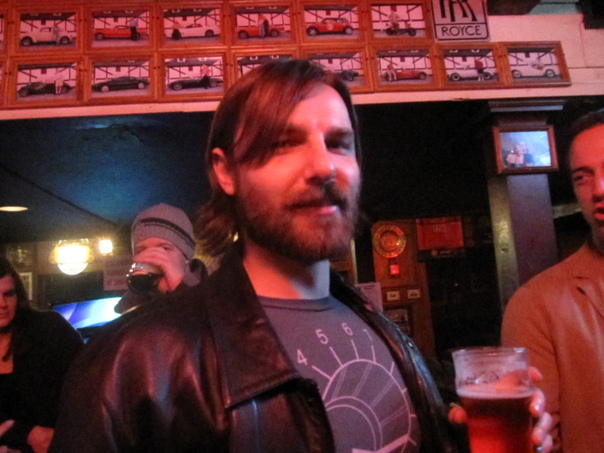 The young bearded man in the leather jacket appears to have had one too many beers.