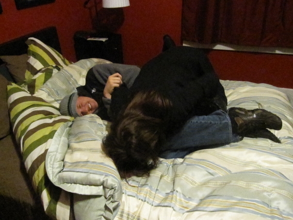 A HAPPY FIGHT AMONG A BROTHER AND A SISTER IN THEIR BEDROOM.