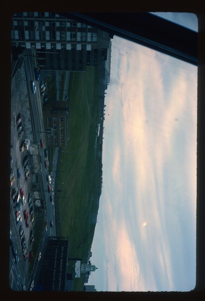 This looks like someone taking a photo from inside, high up, we see cars parked, some buildings, they are white clouds streaked across the sky. |