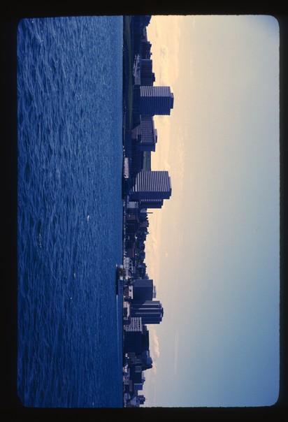 There are many large buildings near the sea.