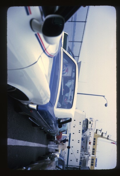 View of a seaport with a small ship offboard and car parked near to ship.