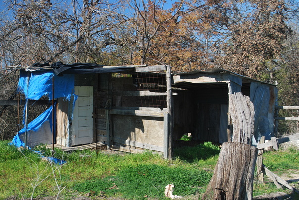 An old wooden shed of various types of wood is at the corner of a fenced in area.