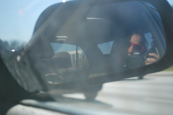 There is a side mirror of the car. Here a girl is ready to take a photo.