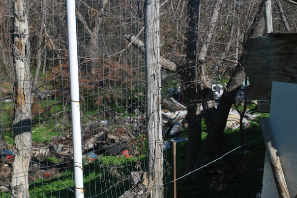 A wire fence is blocking an area with a lot of garbage in a ravine.
