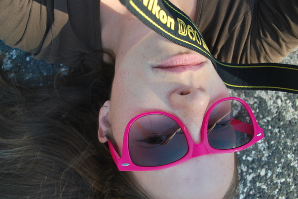 A woman wearing a brown shirt and pink sun glasses is laying on the ground.