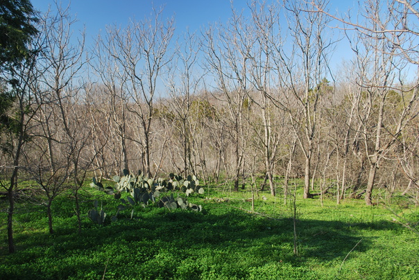 A grove of leafless trees are atop a field of green grass, and bushes.