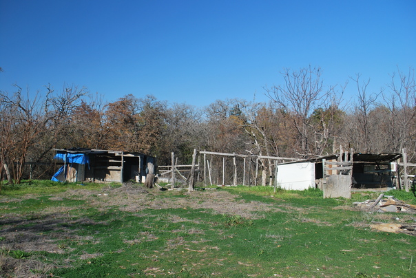 At the end of this green expanse are two wooden sheds at the edge of the fence.