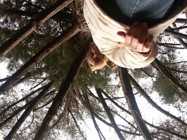 An Ant's eye view of a man is a cream color shrit looking down the trees around him looves very cool. different twist on the Birds eye view.