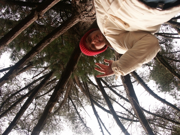 A man in a tree waves and looks down as he climbs.