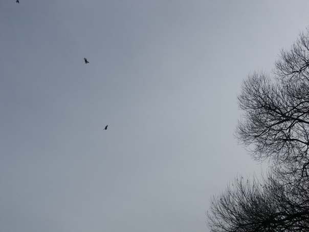 black birds in the gray sky with bare branches of a tree