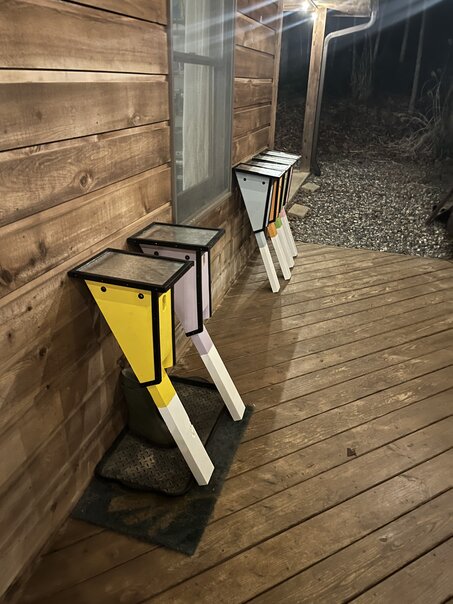 We borrowed a ladder from her friends Geoff and Ashleigh and I scurried up the trees to get them all installed.