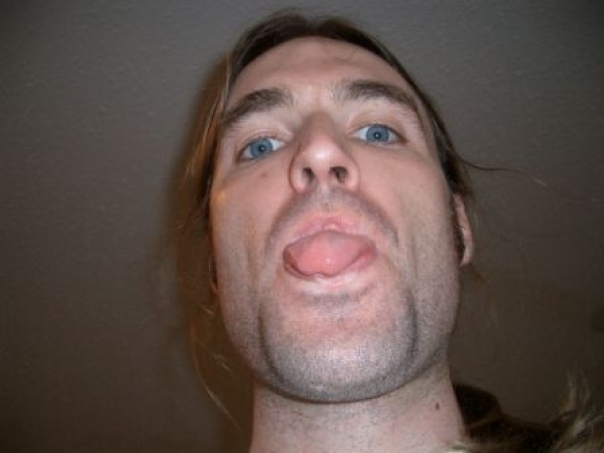 a man with blue eyes sticks his tongue out as he looks at the camera.