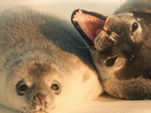 a white seal and a gray seal sitting on a patch of ice