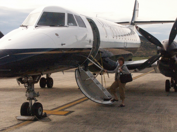 The woman is about ready to board the very small plan at the airport for a business trip.