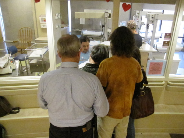 A young man in a blue shirt shows off his new baby to his parents and friends at the hospital nursery.