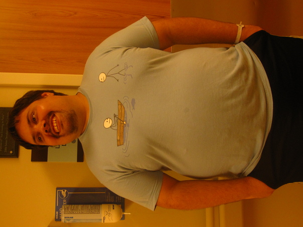 A man is smiling wearing a light blue shirt with a stick figure rowing a boat at the chest height.
