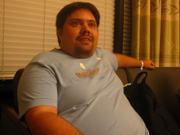 An overweight man with a mustache and goatee wearing a light blue t-shirt.