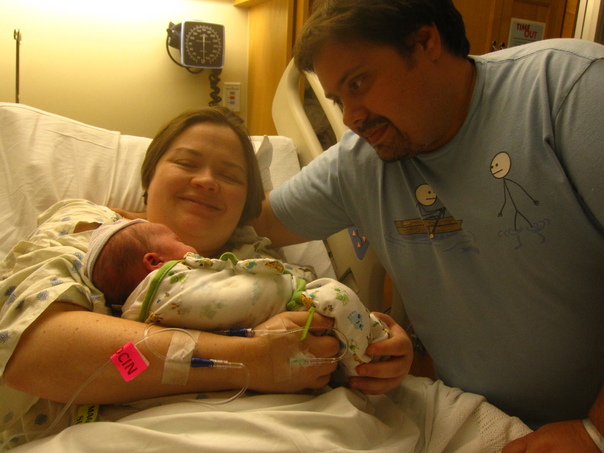 A woman is holding her newborn baby and she is smiling with the man by her side