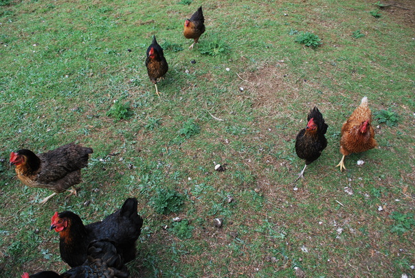 Several different colored chickens walk around in the grass yard.