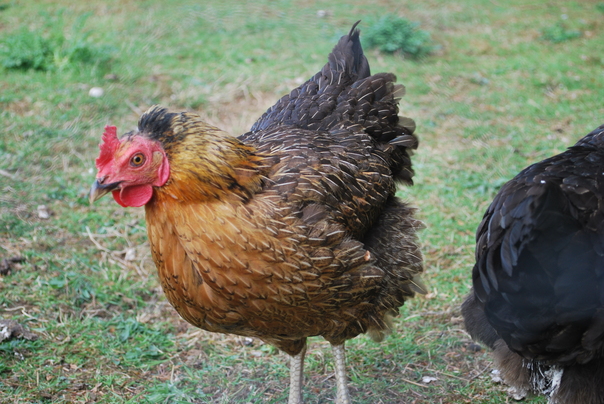 A rooster with brown and black feathers and a short red comb stands on ground with patchy green grass and stares with one eye.