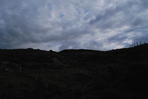 Dark blue and cloudy sky over a grassy hill.