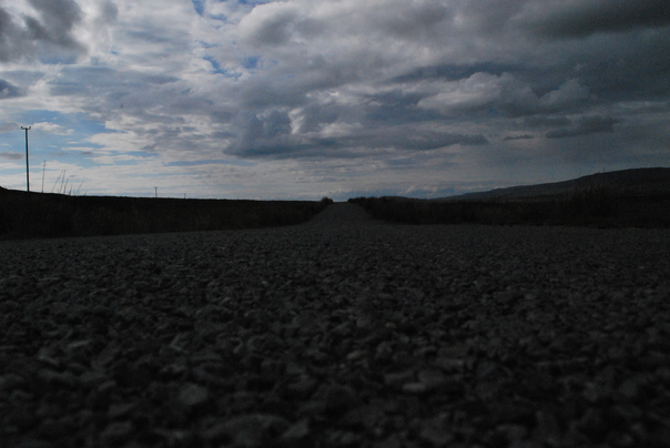 Extremely cloudy skies are showing over a rocky landscape that looks to be in the middle of nowhere, yet there are electric poles in the distance.