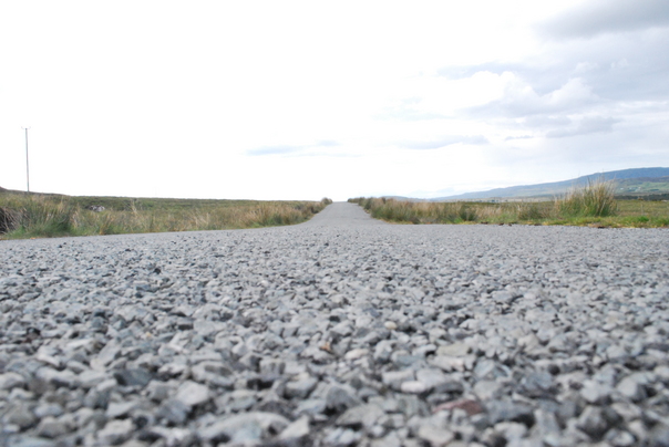 A broad lenghthy road filled with granite stones on it.