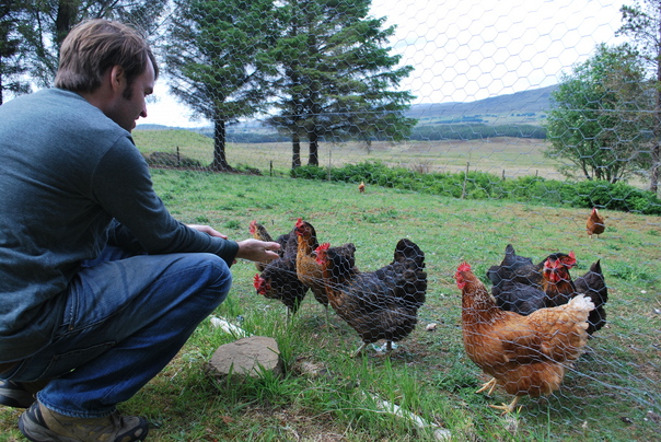 A man feeds a group of chickens though a fence of chicken wire.