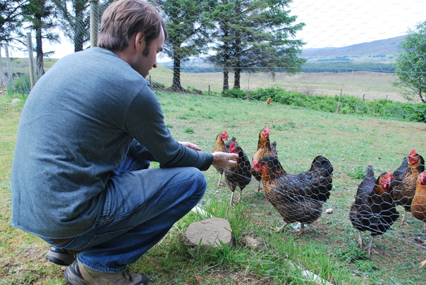 The white man bent down, extending his hands towards the seven chickens standing just beyond the chicken-wire fence.