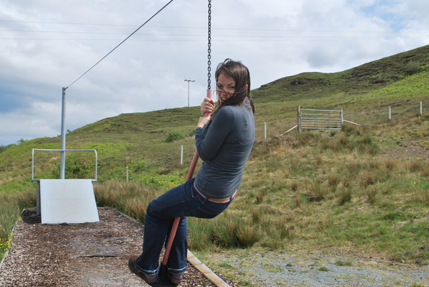 A young woman in jeans and a gray shirt hanging from a chain swing in a field.
