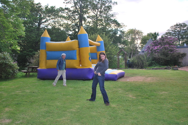 A young girl posing in front of a bounce house.