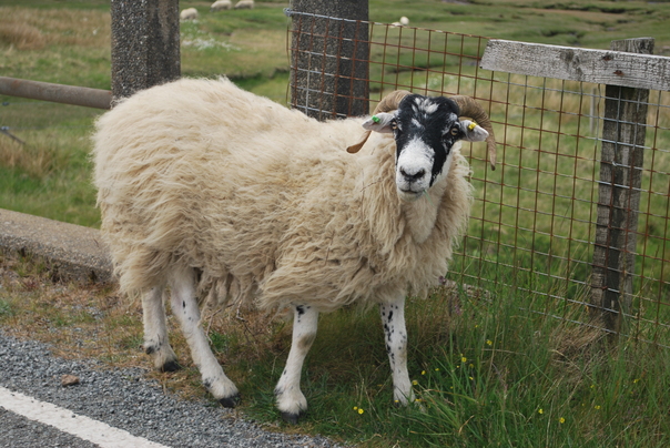The woolly, beige sheep walked along the road, its black markings across its eyes and forehead contrasting with its pale ears, nose, and horns.