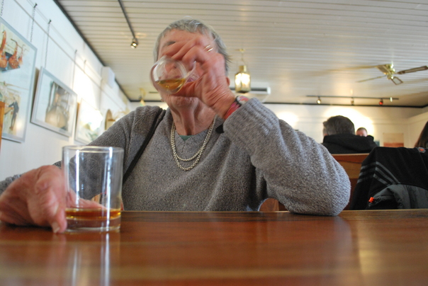 This old lady is drinking multiple glasses of beer.