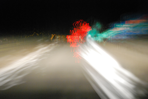 White, red, blue, and yellow lights are all blurred in this picture.