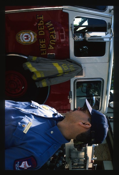 In a reversed image, a man in a blue cap looks at a red Austin, Texas firetruck.