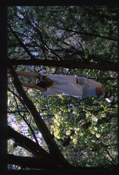 it is a photo of a man climbing on the tree with white t shirt