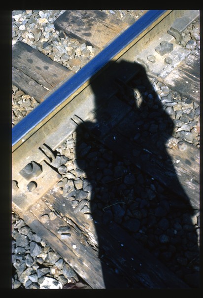 someone taking a picture of railroad tracks while creating a shadow of them selves.