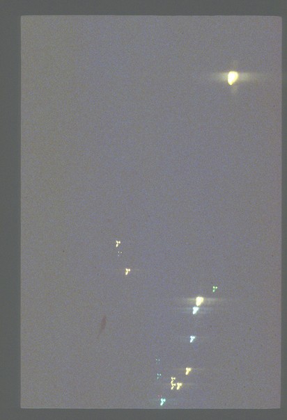 A few extremely blurry lights dance strangely across the grey, empty surface of a photo.